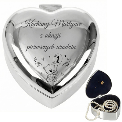 Pozytywka szkatułka serce na roczek – posrebrzana stal, grawer z misiem, melodia „Edelweiss”