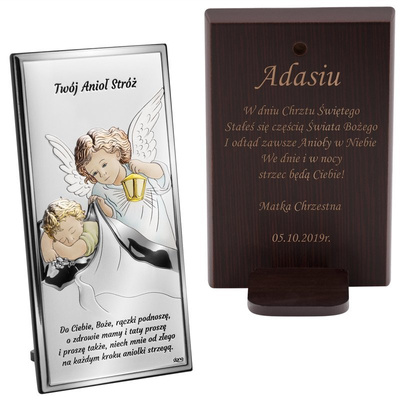 Posrebrzany obrazek Anioł Stróż na Chrzest z grawerem laserowym