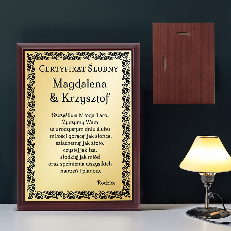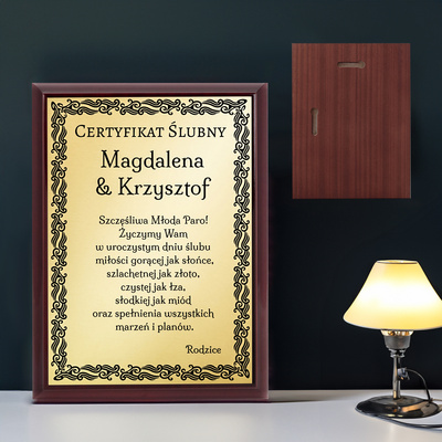 Prezent na ślub / Certyfikat / Drewniany panel, złota tabliczka, dedykacja