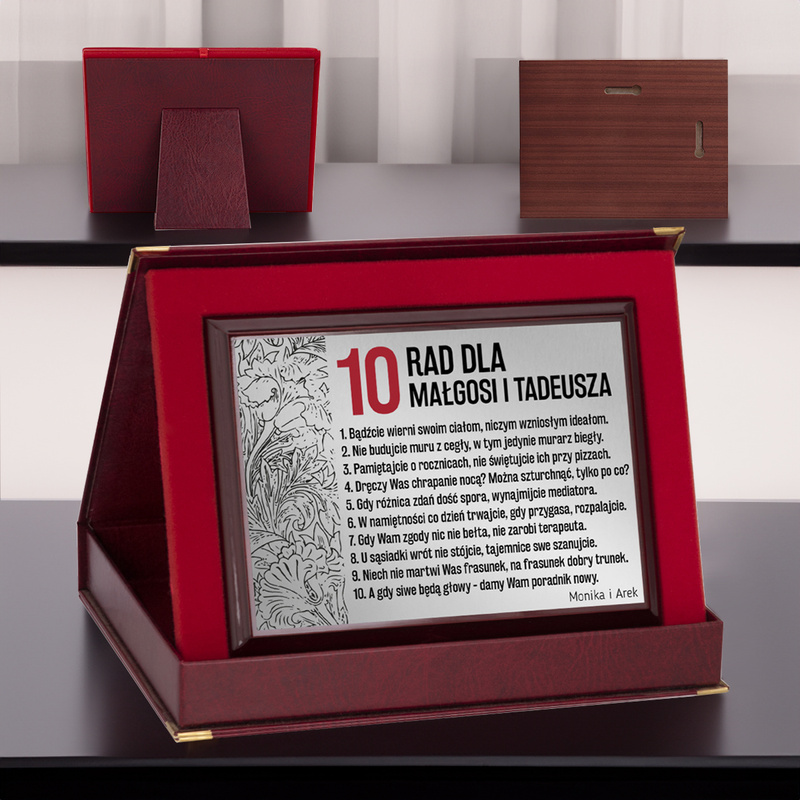 Prezent na ślub / 10 rad / Drewniany panel, srebrna tabliczka, etui, dedykacja