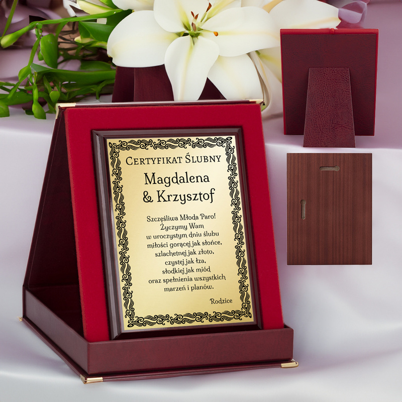 Prezent na ślub / Certyfikat / Drewniany panel, złota tabliczka, etui, dedykacja