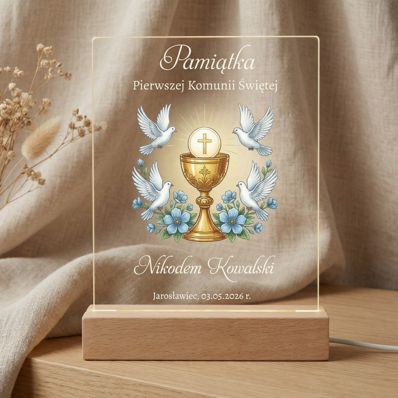 Personalizowana ramka LED na Pierwszą Komunię Świętą – elegancka pamiątka z nadrukiem UV