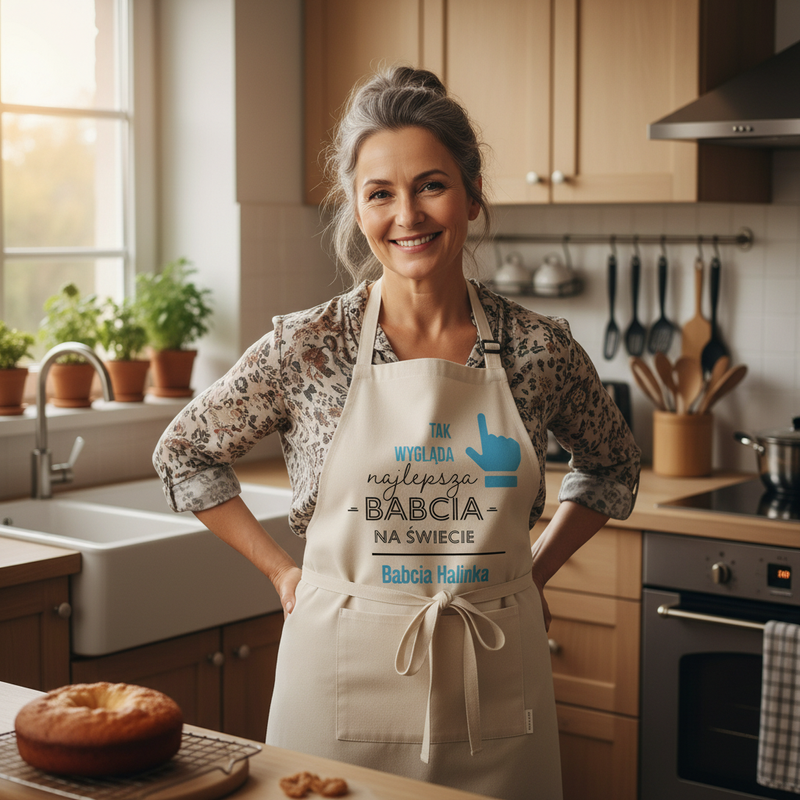 Fartuch kuchenny dla Babci z imieniem – „Pysznie gotuje, przytuli, ucałuje”