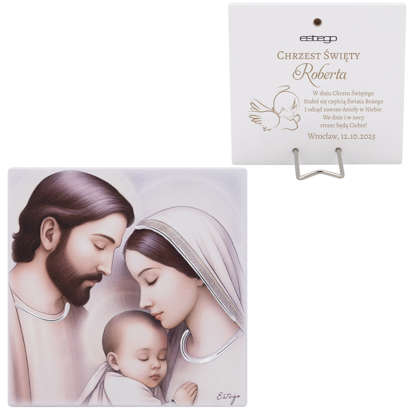 Obrazek Świętej Rodziny malowany na drewnie – elegancka pamiątka Chrztu Świętego z grawerem