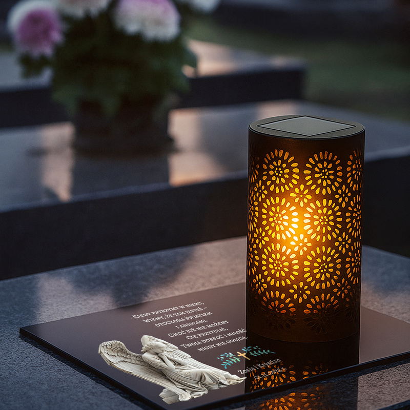 Stylowy zestaw nagrobny – znicz solarny LED + tabliczka pamiątkowa z personalizacją