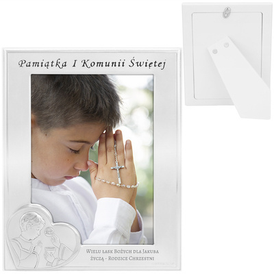 Na górnej krawędzi ramki znajduje się napis Pamiątka I Komunii Świętej, a w dolnym, lewym roku motyw chłopca przy hostii - ramka będzie wyjątkową ozdobą, która świetnie upamiętni ten ważny dzień. Dodatkowo, na ramce umieszczamy personalizowany grawerunek, który sprawi, że prezent będzie wyjątkowy i niepowtarzalny. Imię dziecka, miejsce, czy data uroczystości z pewnością nadadzą ramce sentymentalnego charakteru. Tył ramki został wykonany z solidnego drewna pomalowanego na biało, dzięki czemu prezent tworzy jednolitą, estetyczną całość.