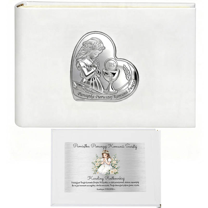 To, co wyróżnia ten album komunijny z dedykacją, to możliwość pełnej personalizacji wnętrza okładki. W środku umieszczana jest srebrna tabliczka dedykacyjna, na której można zamieścić indywidualny tekst, życzenia, grafikę, a nawet zdjęcie dziecka. Dzięki temu prezent staje się osobisty, niepowtarzalny i jeszcze bardziej sentymentalny. Taki album na Komunię z dedykacją od chrzestnej, chrzestnego, dziadków lub rodziców będzie piękną pamiątką o wyjątkowej wartości emocjonalnej.