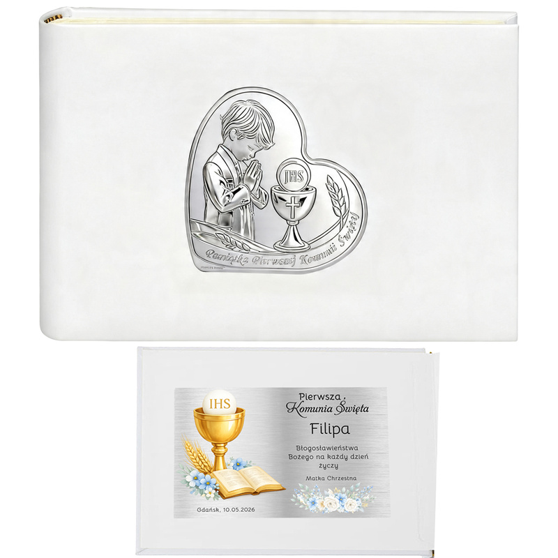 Tak, album został zaprojektowany właśnie jako elegancka pamiątka Pierwszej Komunii Świętej dla chłopca. Srebrny ryngraf z komunijnym motywem pięknie podkreśla charakter uroczystości.