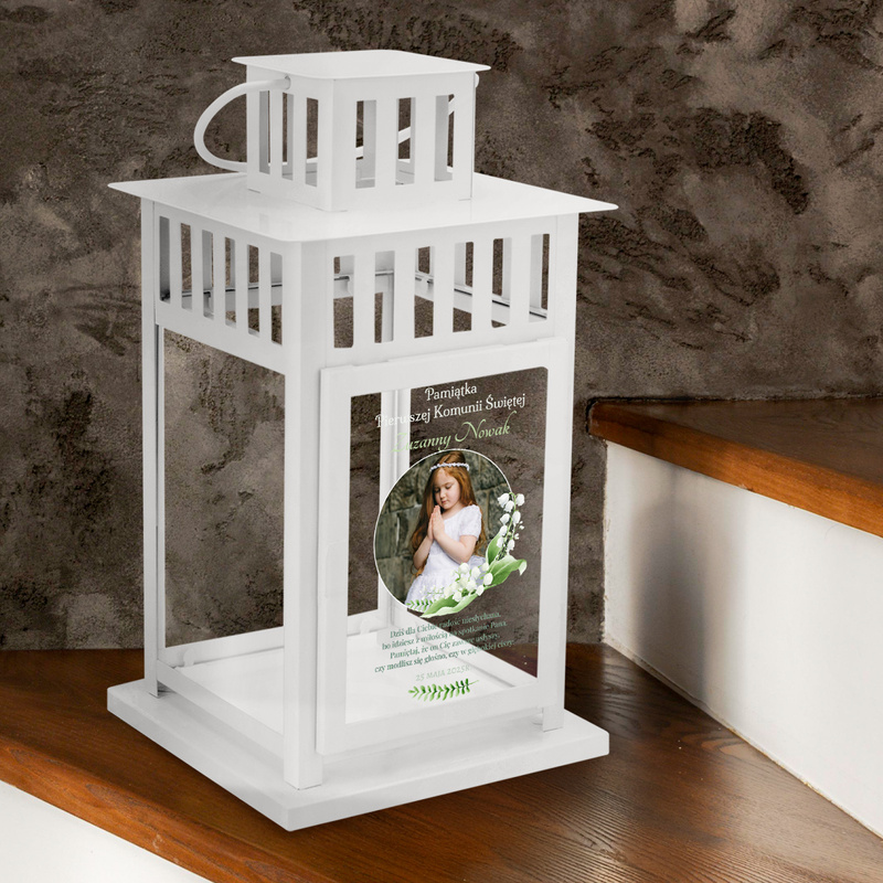Na jednej z szyb znajduje się nadruk z imieniem dziecka, datą uroczystości oraz zdjęciem, ozdobiony delikatnym motywem konwalii. Personalizacja sprawia, że lampion staje się unikalną pamiątką tej wyjątkowej chwili.