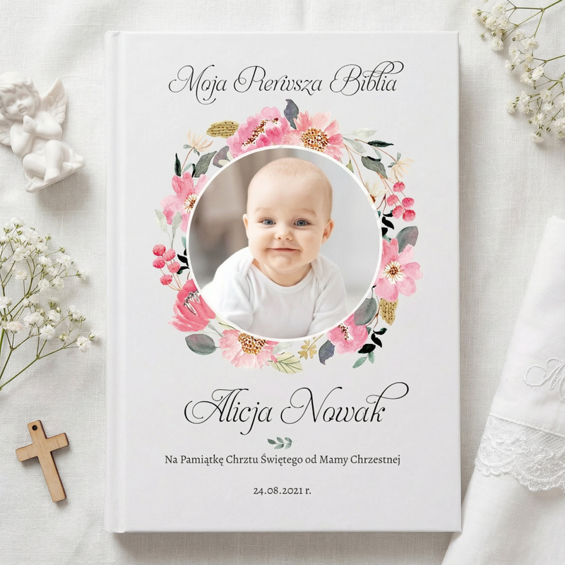 Biblia jest świetnym prezentem na różne uroczystości religijne - chrzest, komunię, czy bierzmowanie. Proponujemy państwu wyjątkową, personalizowaną biblię, która będzie piękną pamiątką chrztu świętego. Biblia będzie wspaniałym podarunkiem zarówno od rodziców lub dziadków, ale również jako prezent od rodziców chrzestnych. Na okładce znajduje się miejsce na zdjęcie dziecka, imię i nazwisko i inny, dowolny tekst, który zdecydują się państwo umieścić na prezencie. Delikatne, różowe kwiatki tworzące ramkę do zdjęcia dziecka sprawiają, że prezent będzie idealnym wyborem na prezent na chrzest dla dziewczynki. Dzięki prostemu i intuicyjnemu edytorowi na naszej stronie, z łatwością stworzą państwo swój projekt.
