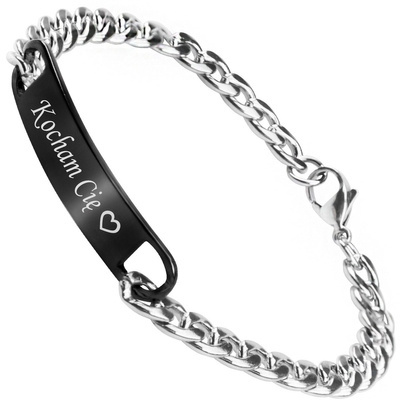 Proponujemy Państwu wyjątkową bransoletę wykonaną ze stali szlachetnej 316L z indywidualnym grawerem. Bransoletka zapakowana zostanie w eleganckie pudełko prezentowe. Blaszka została pomalowana na czarny kolor.