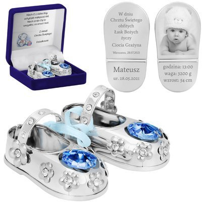 Proponujemy Państwu śliczne buciki platerowane srebrem, z kryształami oraz indywidualnym grawerem. W cenę wchodzi grawer na podeszwach obu bucików. Uzyskany napis jest trwały i nie ściera się. Na przedmiotach wygrawerujemy Państwa grafikę, zdjęcie, dedykację...