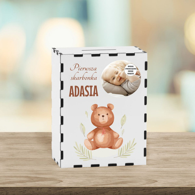 Drewniana skarbonka ze zdjęciem dziecka na roczek / Prezent z Nadrukiem