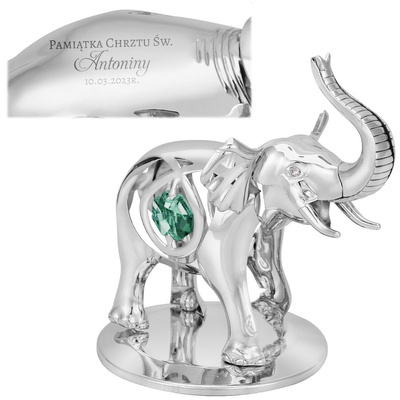 Proponujemy państwu piękną, wyjątkową figurkę w kształcie słonika z indywidualnym grawerunkiem. Ozdoba jest wykonana z wysokiej jakości stali posrebrzanej pokrytej lakierem ochronnym, dzięki czemu na długo zachowuje swój blask. Stabilna podstawa, na której stoi słonik sprawia, że można go bezpiecznie postawić, a filcowe zabezpieczenie chroni meble przed zarysowaniem. W centralnej części figurki znajduje się duży, zielony kryształ, co nadaje ozdobie szlachetnego charakteru. Delikatne, estetyczne wykonanie sprawia, że jest to idealna ozdoba pokoju dziecięcego. Dodatkowo, wykonany na górnej części figurki personalizowany grawerunek nadaje ozdobie wyjątkowego i indywidualnego charakteru.