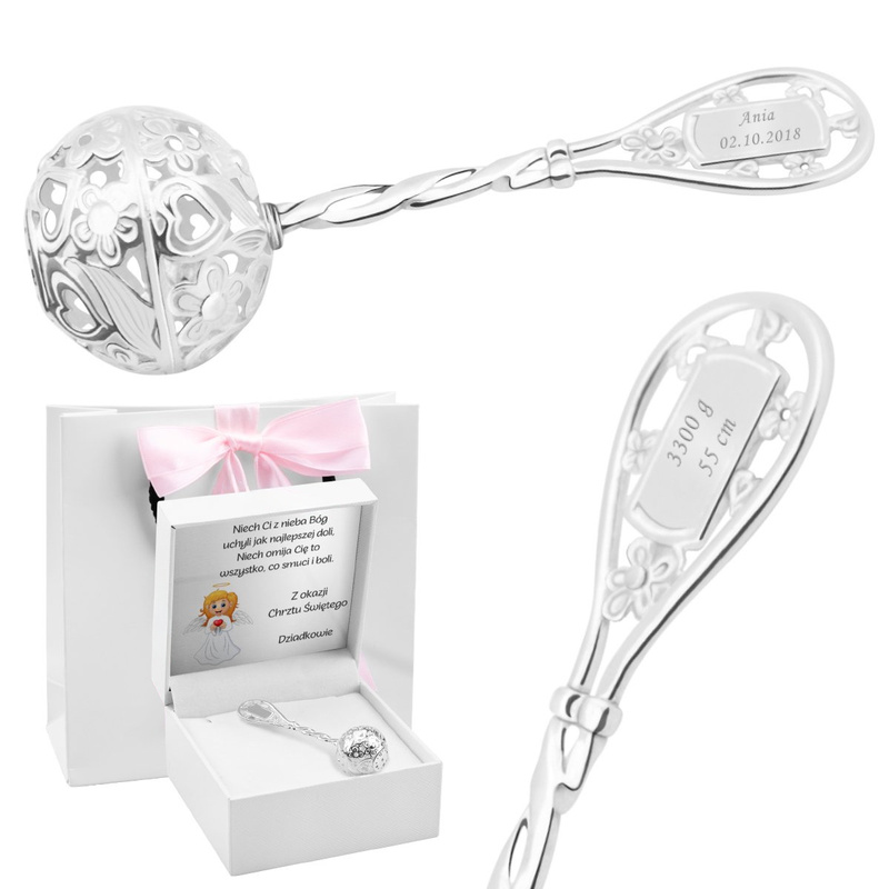 Proponujemy Państwu prześliczną srebrną grzechotkę z indywidualnym grawerem. Piękna i niezapomniana pamiątka z okazji chrztu, narodzin dziecka, roczku.