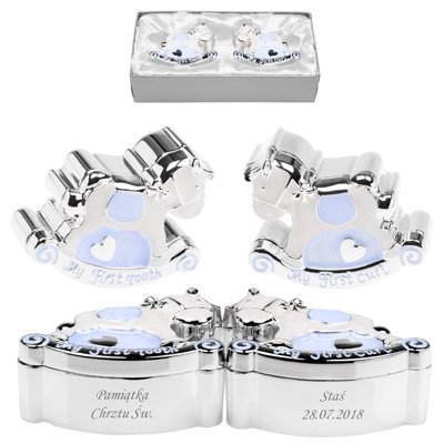 Proponujemy Państwu 2 szkatułki w kształcie koni na biegunach na pierwszy ząbek i pukiel włosów. Szkatułki umieszczone są w szarym pudełku z białą wyściółką. Koniki są w kolorze beżowo-niebieskim. Napisy "My First Tooth" oraz "My First Curl" są już umieszczone od producenta.
