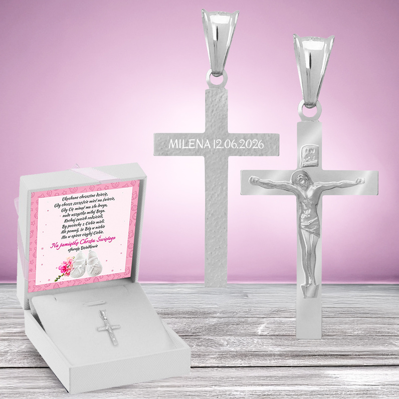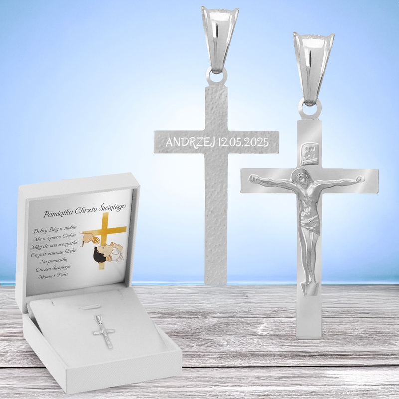 • grawerunek na rewersie krzyżyka np. krótkie imię i data, maksymalnie 20 znaków (łącznie ze spacjami)