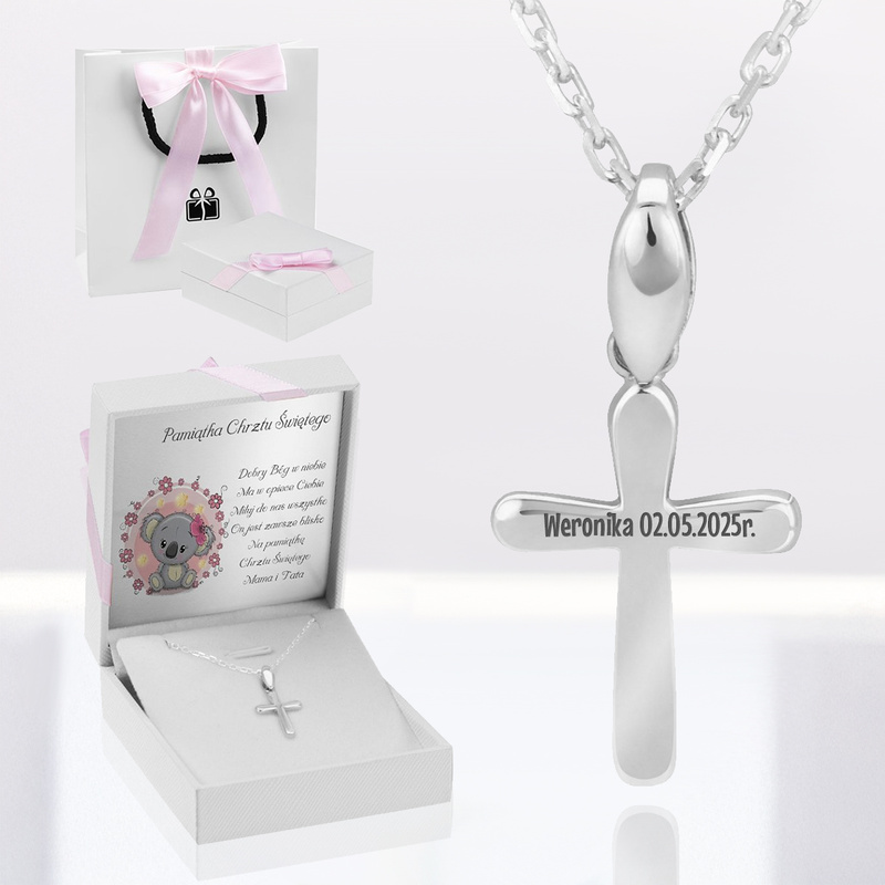 • grawerunek na rewersie krzyżyka np. krótkie imię i data, maksymalnie 20 znaków (łącznie ze spacjami)