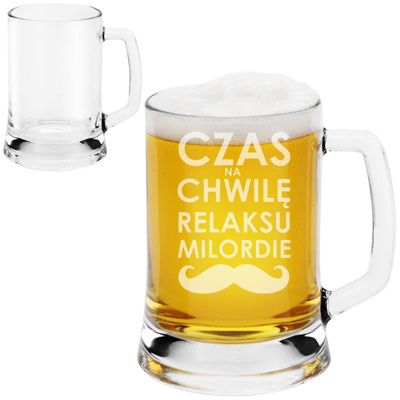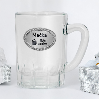 Elegancki i bardzo subtelny kufel szklany z posrebrzaną etykietką. To idealny prezent na wiele okazji: na urodziny, imieniny, rocznicę, dzień ojca i na prezent biznesowy. Kufel ma klasyczny kształt, grube dno i wygodny uchwyt z wyprofilowanym miejscem na kciuk – dzięki temu korzysta się z niego bardzo wygodnie i bezpiecznie. Uroku dodaje mu niezwykle ozdobna, posrebrzana etykietka, na której można umieścić indywidualny grawer.