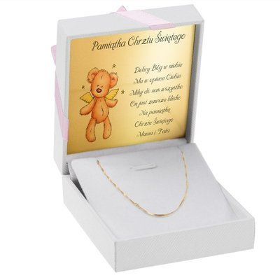 Subtelny łańcuszek, wykonany z najwyższej jakości złota próby 585. Świadczą o tym dołączone metki jubilerskie oraz wybita na łańcuszku próba, zbadana przez Polski Urząd Probierczy. Łańcuszek przez oryginalny splot pięknie pasuję do każdej zawieszki/wisiorka bądź medalik. Upominek doskonały na wszelkiego rodzaju ważne okoliczności takie jak urodziny, Chrzciny czy I Komunia Święta.