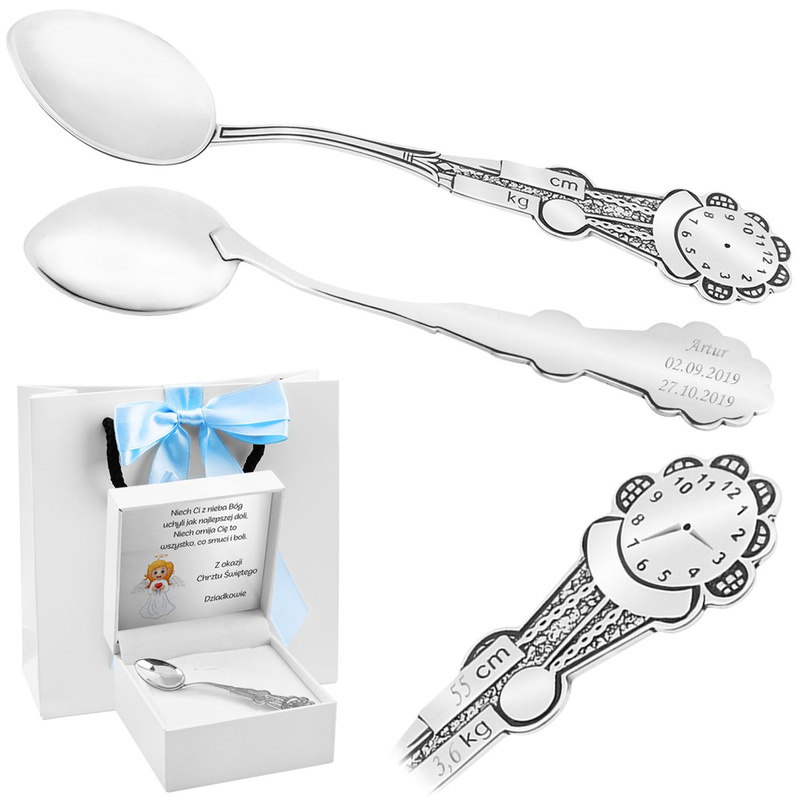 W cenę wliczony grawer na łyżeczce (maksymalnie 100 znaków) oraz godzina na tarczy zegara, waga i wzrost. Napis na łyżeczce umieścimy w technice grawerowania diamentem. Uzyskany napis jest trwały i nie ściera się. Dodatkowo tabliczka z dowolną dedykacją.
