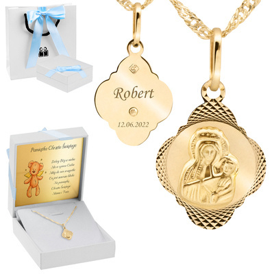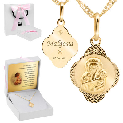 Proponujemy Państwu prześliczny medalik z wizerunkiem Matki Boskiej z dzieciątkiem z delikatnymi zdobieniami na rantach. Medalik został wykonany najwyższej próby złota 585. Wykonany jest ręcznie z niesamowitą dbałością o detale. Posiada cechę Urzędu probierczego. Do zestawu dołączamy łańcuszek.