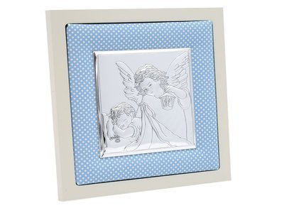 Obrazek srebrny Anioł Stróż w niebieskiej ramce pamiątka chrztu na chrzest z Dedykacją