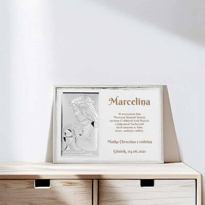 Proponujemy Państwu piękny obrazek przedstawiający chłopca przyjmującego Komunię Świętą z indywidualnym grawerem. Płaskorzeźba wykonana jest w technologii bilaminatu, co oznacza że na blachę z aluminium jest nałożona warstwa srebra pr. 925. Warstwa srebra zabezpieczona jest specjalnym lakierem ochronnym, dzięki któremu nie czarnieje i zachowuje swój blask. Obrazek został wykonany z drewna a później pomalowany na biały kolor. Obrazek można powiesić lub postawić.