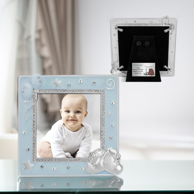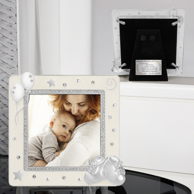 Ramka wykonana jest z niezwykłą dokładnością. Całość powstała z posrebrzanej stali, a front zalany został masą perłową. Głównym motywem ramki, są buciki. Zdjęcie dziecka otoczone jest dużą ilością pięknie mieniących się cyrkonii. Dzięki temu całość jest rozświetlona i widoczna z daleka. Dzięki neutralnej kolorystyce przedmiot ozdobi każde wnętrze. Ramka ma duży potencjał dekoracyjny i doskonale ociepla przestrzeń, nadając jej osobistego charakteru.