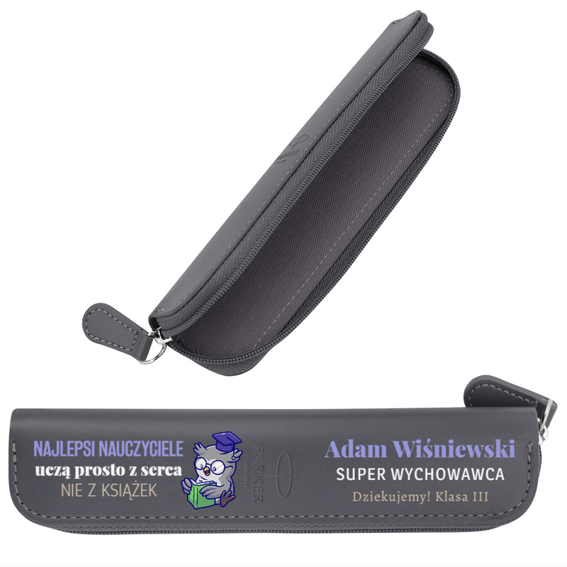 Na etui można nanieść imię, nazwisko, klasę, cytat, datę lub kolorową grafikę (np. sowa, biret, dyplom). Nadruk UV jest trwały, estetyczny i odporny na ścieranie. Etui Parker Burgundy to doskonały wybór na prezent dla nauczyciela, wychowawcy, szefa, ucznia, absolwenta, pracownika lub bliskiej osoby – pasuje na wiele okazji.