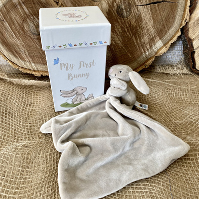 Przytulanka marki Jellycat w kształcie królika to produkt ręcznie wykonany. Ten uroczy produkt to pluszowy króliczek z kocykiem, który może stać się pierwszym ulubionym przyjacielem maluszka. Jest ręcznie wykonany z wyjątkową dbałością o szczegóły, co nadaje mu niepowtarzalny charakter. Miękki, beżowy kocyk przymocowany do króliczka jest idealny do przytulania, zapewniając komfort i ciepło. W zestawie znajduje się eleganckie pudełko ozdobione napisem "My First Bunny" oraz uroczymi ilustracjami króliczka i motylków, co sprawia, że produkt jest również doskonały na prezent dla noworodka.