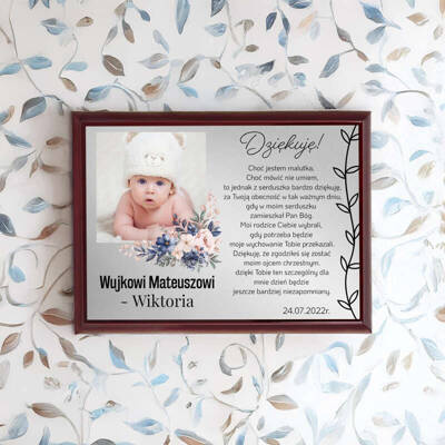 Nasza propozycja to efektowne podziękowanie złożone z dwóch elementów: drewnianego podkładu przygotowanego do powieszenia oraz aluminiowej tabliczki w kolorze złotym. To właśnie na niej umieścimy dowolną treść podziękowań.