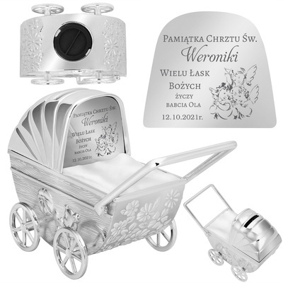 Proponujemy Państwu śliczną posrebrzaną skarbonkę Pieska z indywidualnym grawerem. Skarbonka wykonana jest ze stali oraz pokryta warstwą srebra pr. 925 w technologii laminowania srebrem. Warstwa srebra zabezpieczona jest specjalnym lakierem ochronnym, dzięki któremu nie czarnieje i zachowuje swój blask.