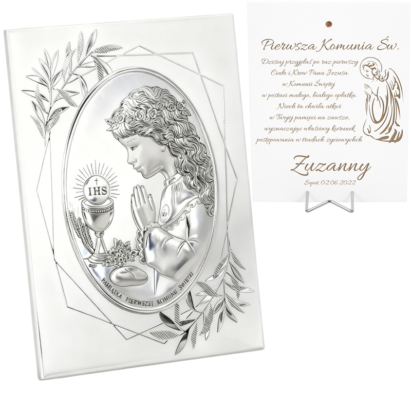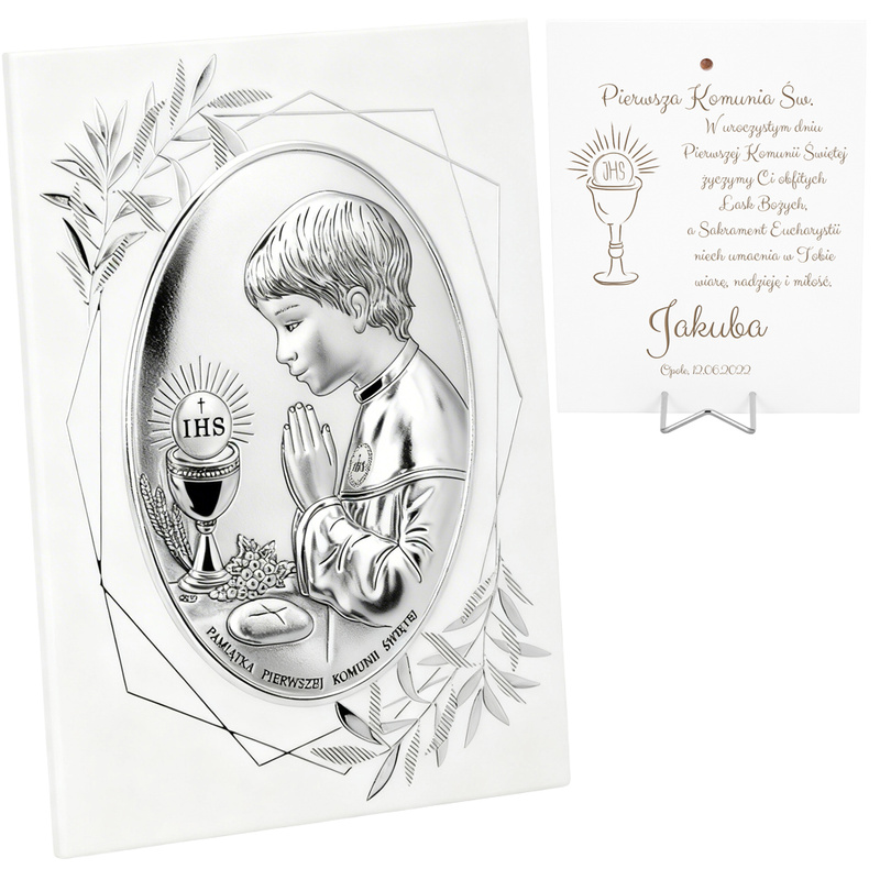 Obrazek z wizerunkiem modlącego się chłopca to doskonale dopasowana do uroczystości ozdoba. Ta piękna pamiątka doniosłych chwil z dzieciństwa udekoruje wnętrze. Obrazek można zawiesić na ścianę lub postawić.