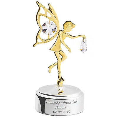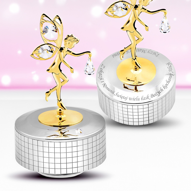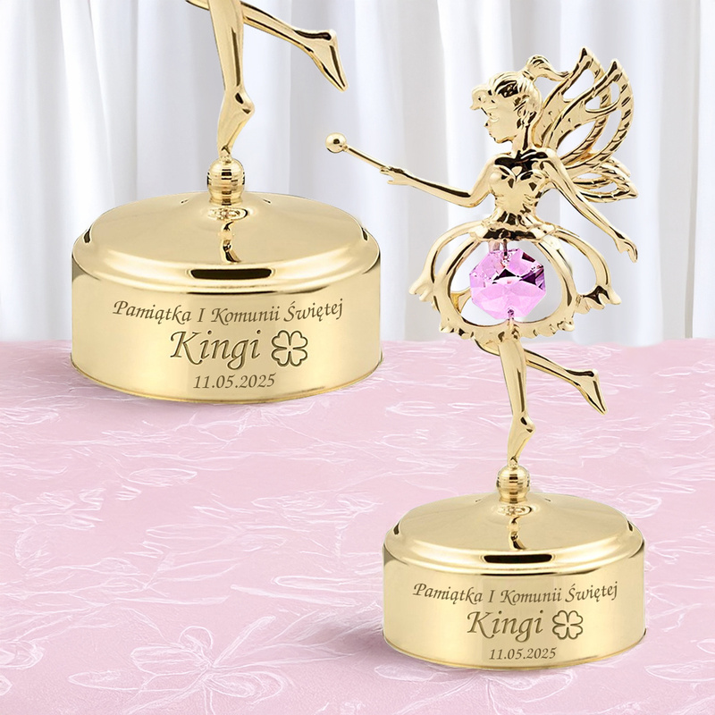 Prześliczna pozłacana mała pozytywka z dziewczynką elfem ozdobiona różowym kryształem ciętym metodą Swarovskiego oraz indywidualnym grawerem. Produkt wykonany jest ze stali pozłacanej.