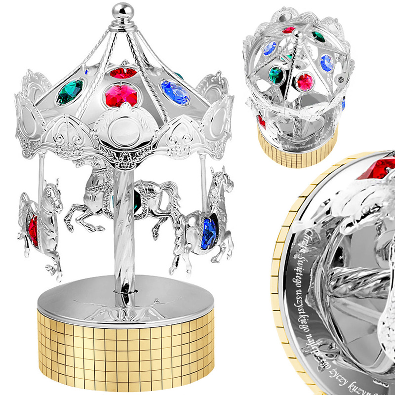 Państwa dedykację umieścimy z przodu podstawy pozytywki w trwałej technice grawerowania laserowym. Charakteryzuje się elegancją oraz bardzo wysoką jakością wykonania. Pozytywkę nakręca się od spodu, a ona obraca się wokół własnej osi - gra melodię " It's a small world".