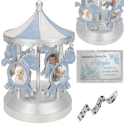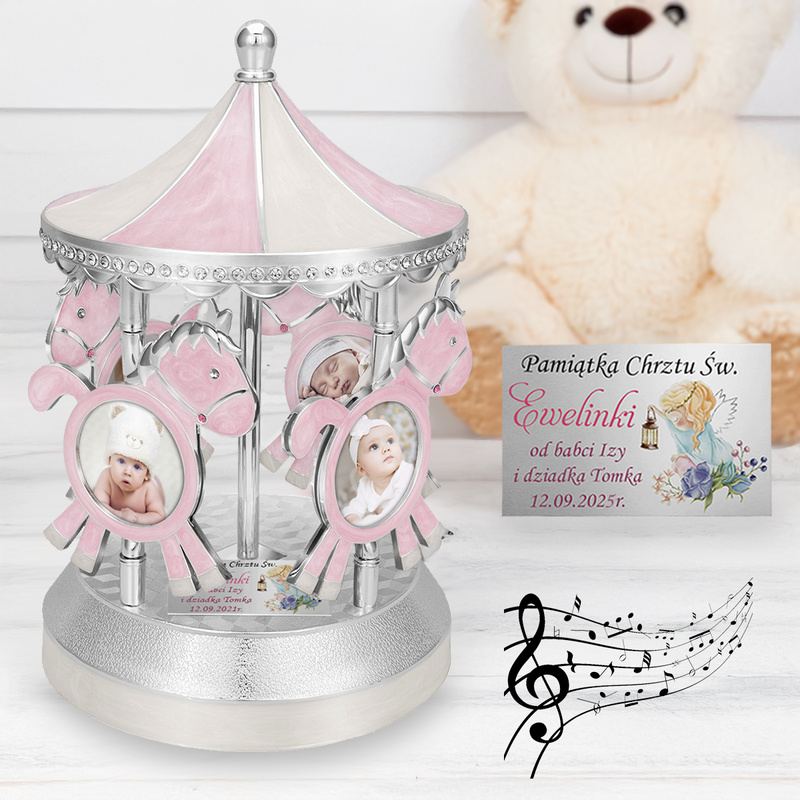 Pozytywka jest tak urocza i dziecięca, że stanowi wspaniały prezent z okazji Chrztu Św., Roczku czy kolejnych urodzin. W środku karuzeli, między konikami można umieścić tabliczkę w kolorze srebrnym, na której mogą znaleźć się osobiste słowa życzeń z grafiką. Dzięki temu oraz opcji wstawienia zdjęć, pozytywka będzie niepowtarzalną pamiątką zarówno dla rodziców jak i dziecka w przyszłości.