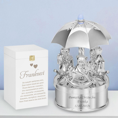 Na podstawie pozytywki możemy wykonać dowolny grawerunek. Tak dopasowana do uroczystości pozytywka, będzie idealną pamiątką chrztu.