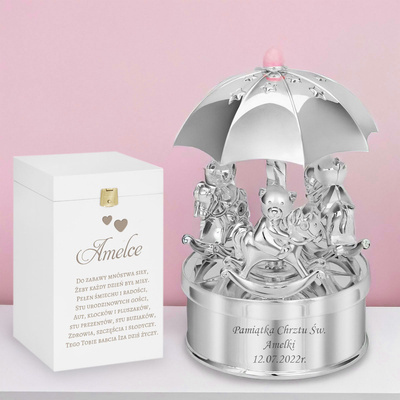 Pozytywka w kształcie karuzeli to wykonana z dbałością o detale ozdoba. Utrzymana jest ona w srebrnej tonacji. Jedynie na górze jest różowy akcent. Piękny połysk i uniwersalne wzornictwo sprawiają, że doskonale prezentuje się w każdym stylu. Ozdobi zarówno salon, jak i pokój dziecka.