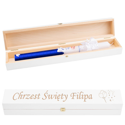 Pięknie wyglądająca skrzynka upamiętniająca szczególny dzień jakim jest Chrzest Święty lub I Komunia Święta.