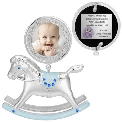 Konik na biegunach jest nieodłącznym symbolem dzieciństwa, który kojarzy się z beztroską i zabawą. Nasza ramka na zdjęcia, która przybiera ten kształt, będzie idealnym prezentem na chrzest, roczek, lub inne wydarzenia w życiu maluszka. Delikatne, niebieskie akcenty idealnie pasują do srebrnego koloru i sprawiają, że ramka jest świetnym pomysłem na prezent dla chłopca. Dzięki solidnemu i estetycznemu wykonaniu, ramka będzie jednocześnie piękną ozdobą domu. Na tylnej części ramki umieszczamy tabliczkę z indywidualnym nadrukiem, co czyni prezent wyjątkowym i niepowtarzalnym.