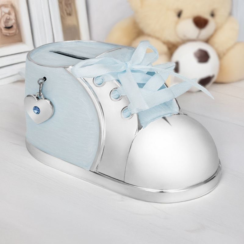 Skarbonka Błękitny Bucik to wykonana z dbałością o szczegóły ozdoba, która zachwyca połyskiem. Połączenie perłowej masy w kolorze błękitnym i posrebrzonego metalu daje imponujący efekt. Tak wykonana skarbonka to doskonały pomysł na prezent dla chłopczyka. Ozdobiona błękitną cyrkonią i wstążką pamiątka pięknie udekoruje dziecięcy pokój lub salon.