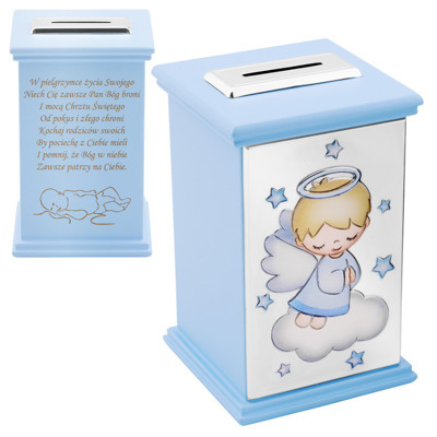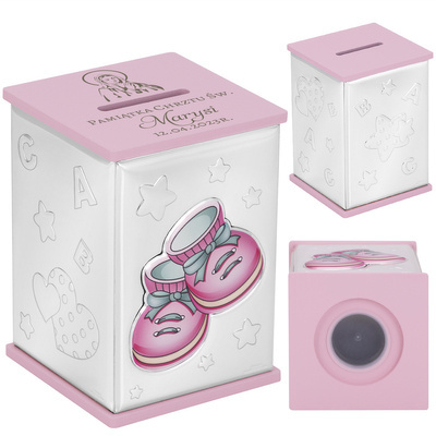Skarbonka została wykonana z wysokiej jakości stali posrebrzanej, która sprawia, że skarbonka wyróżnia się wyjątkowym blaskiem. Lakier ochronny odpowiednio zabezpieczy prezent, dzięki czemu dziecko będzie mogło cieszyć się skarbonki przez wiele lat. Wieczko i podstawa zostały wykonane z solidnego drewna, dzięki czemu nie musimy się martwić o wytrzymałość produktu. Delikatne, dziecięce motywy ozdobne w postaci bucików, literek i serduszek dodatkowo nadają skarbonce uroczego, dziecięcego charakteru.
