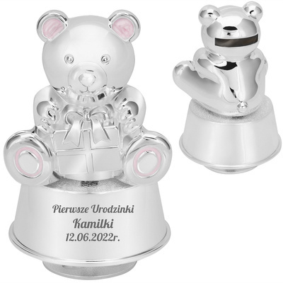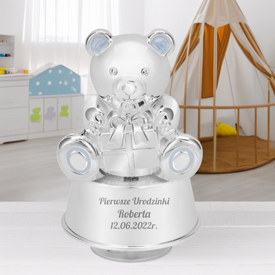 Skarbonka z pozytywką w kształcie misia z prezentem to atrakcyjna ozdoba, która doskonale sprawdzi się jako upominek z okazji pierwszych urodzin.