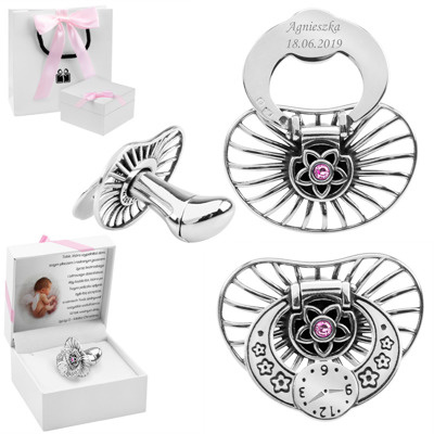 - grawer na smoczku (na rączce max 20 znaków np. imię i data, oraz godzina urodzenia na tarczy zegara)