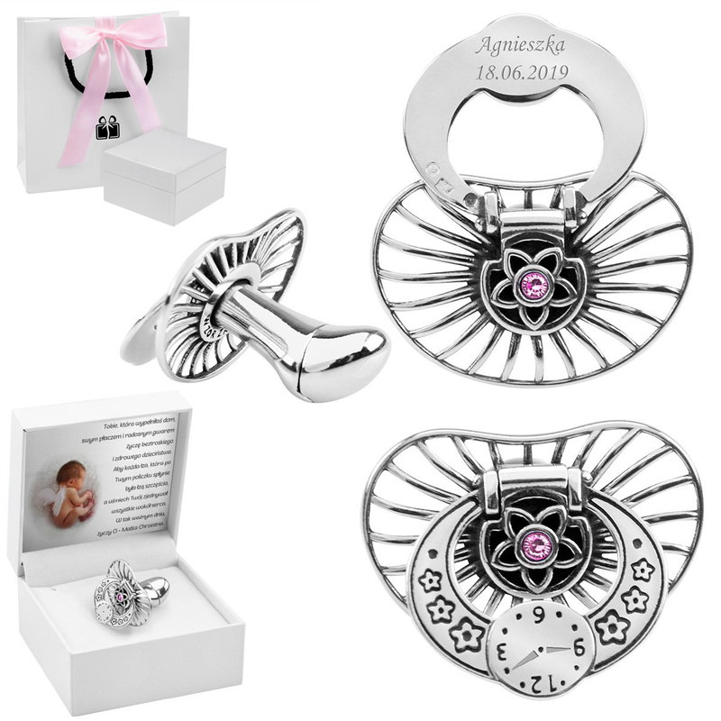 Smoczek Srebrny różowy kamyk na Chrzest Grawer