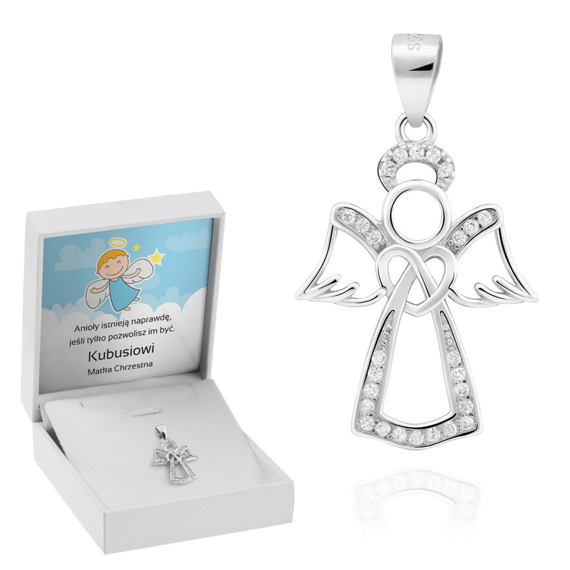Anioł stróż wykonany z najwyższej jakości srebra próby 925 zdobiony cyrkoniami. Zawieszka wykonana z dbałością o każdy detal. Symbol opieki boskiej, doskonałości, bezpieczeństwa, pokoju i radości. Kształt aniołka jest dość popularną i tradycyjną formą, ale przez zdobienia delikatnymi cyrkoniami nabiera on nowoczesności.