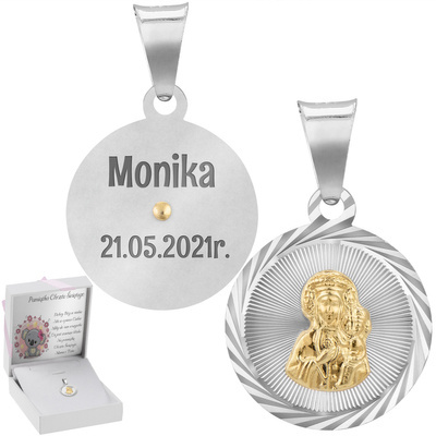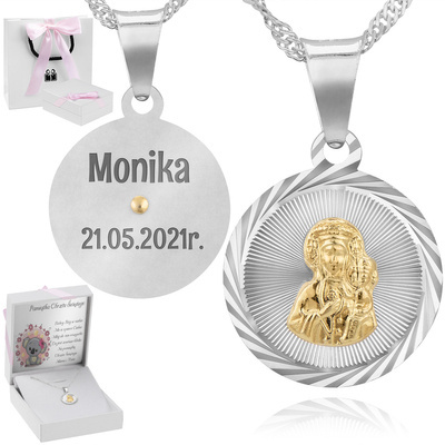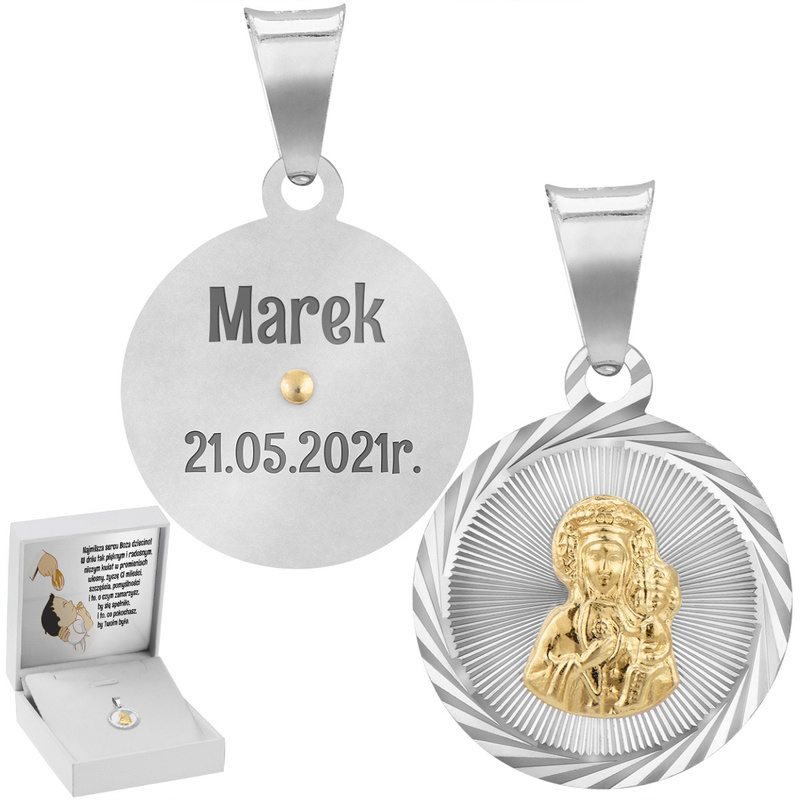 Na odwrocie medalika można wykonać niewielki grawerunek z imieniem i datą. W komplecie z medalikiem jest srebrny łańcuszek.
