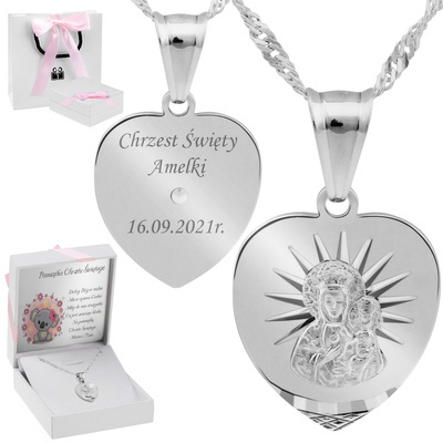 Duży, srebrny medalik w kształcie serca z wizerunkiem Matki Boskiej Częstochowskiej. Idealny dla dziecka przystępującego do I Komunii Św. Sprawdzi się także jako prezent na Chrzest Św. i Bierzmowanie. Medalik jest cennym przedmiotem, który zyskuje na wartości sentymentalnej z upływem lat. Ze względu na swój religijny charakter, często jest noszony niezmiennie przez całe życie.