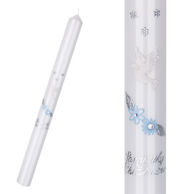 Proponujemy Państwu elegancką święcę, która jest nieodłącznym elementem uroczystość Chrztu, Komunii. Świeca jest ręcznie zdobiona przez co zyskuje swój niepowtarzalny charakter. Świeca dla chłopca lub dziewczynki w tonacji srebrnej z napisem Pamiątka Chrztu Św. Na powierzchni został umieszczony motyw Gołębia symbolizującego Ducha Świętego.